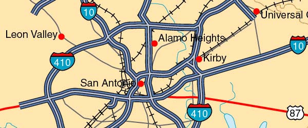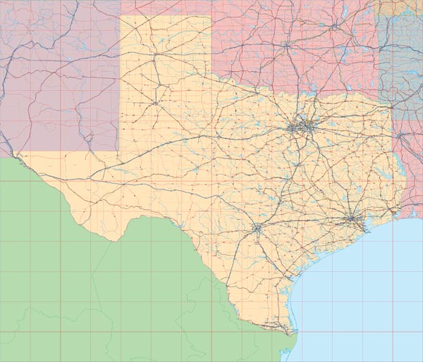 ![]() Detail view of EPS Vector Map of Texas - the land fill color is switched on. The EPS Vector map for Texas has 26 layers which may be individually modified or removed. Select the Vector only EPS map of Texas option to download this style map. |