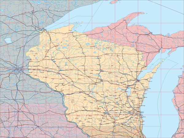 ![]() Detail view of EPS Vector Map of Wisconsin - the land fill color is switched on. The EPS Vector map for Wisconsin has 24 layers which may be individually modified or removed. Select the Vector only EPS map of Wisconsin option to download this style map. |